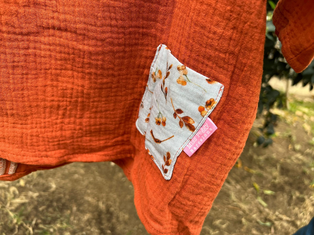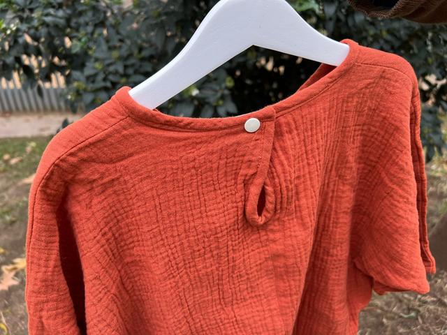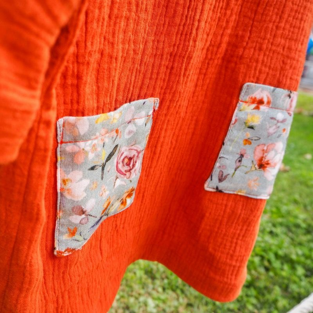 Vestido tipo túnica confeccionado con muselina orgánica de doble capa, suave y colorida. De corte amplio y suelto, mangas hasta el codo, largo hasta la rodilla. Dos bolsillos frontales. Se ata en la espalda con un simple "snap" de botón. Diseñado para poderlo usar con jersey de manga larga debajo y leggins en otoño-invierno, y como vestido ligero en primavera-verano.