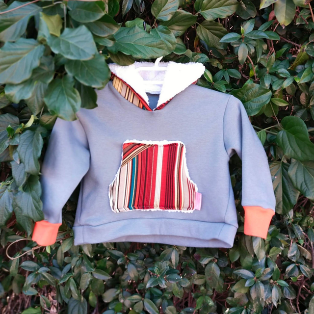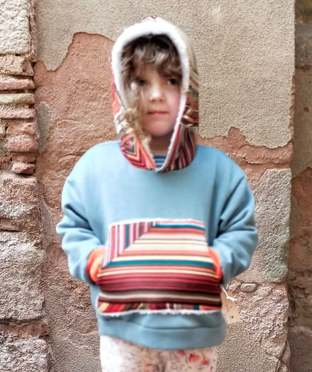 Sudadera de felpa de algodón con certificado OEKO-TEX amplia y holgada, con capucha y bolsillo central forrado con borreguito. 3 tallas disponibles, desde los 2 hasta los 6 años.