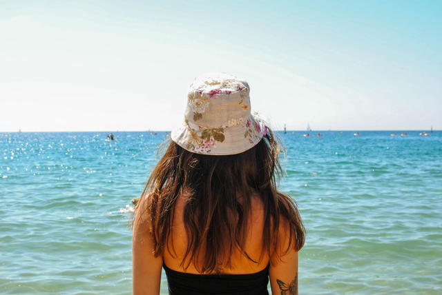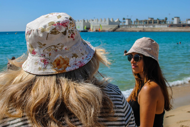 Gorro para el sol reversible de loneta, modelo bucket. 100% algodón en interior y exterior. Tela color marrón craft por una cara y estampado de flores por la otra.