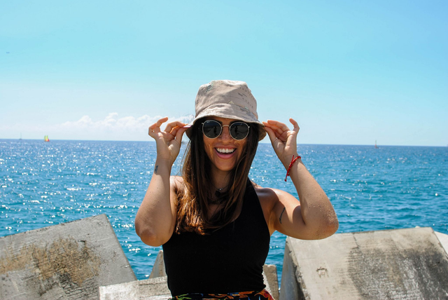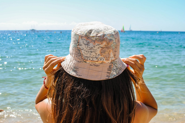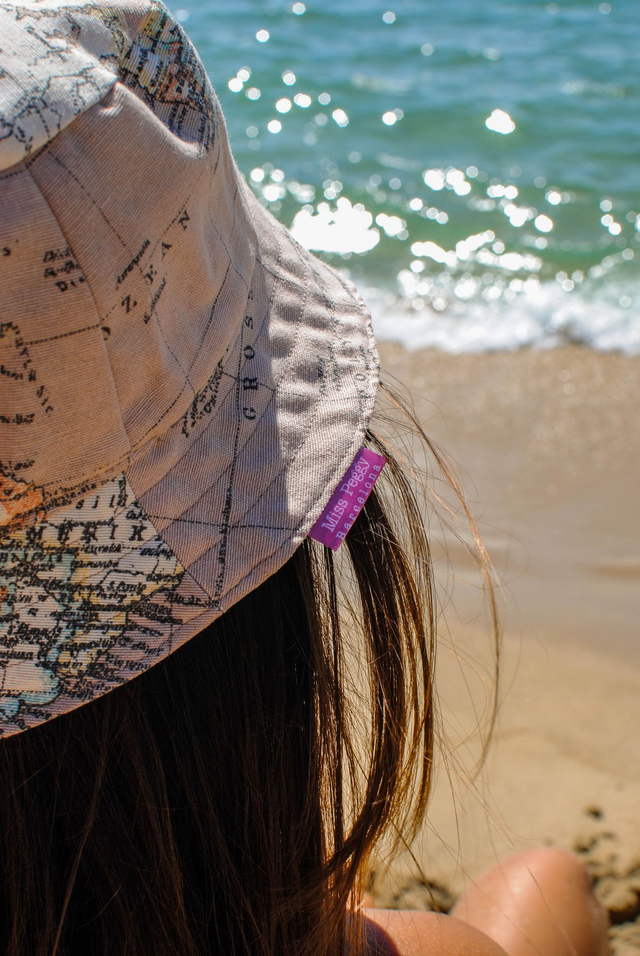 Gorro para el sol reversible de loneta, modelo bucket. 100% algodón en su cara interior, color marrón craft. Cara exterior de loneta de algodón y poliester, con estampado de mapa.
